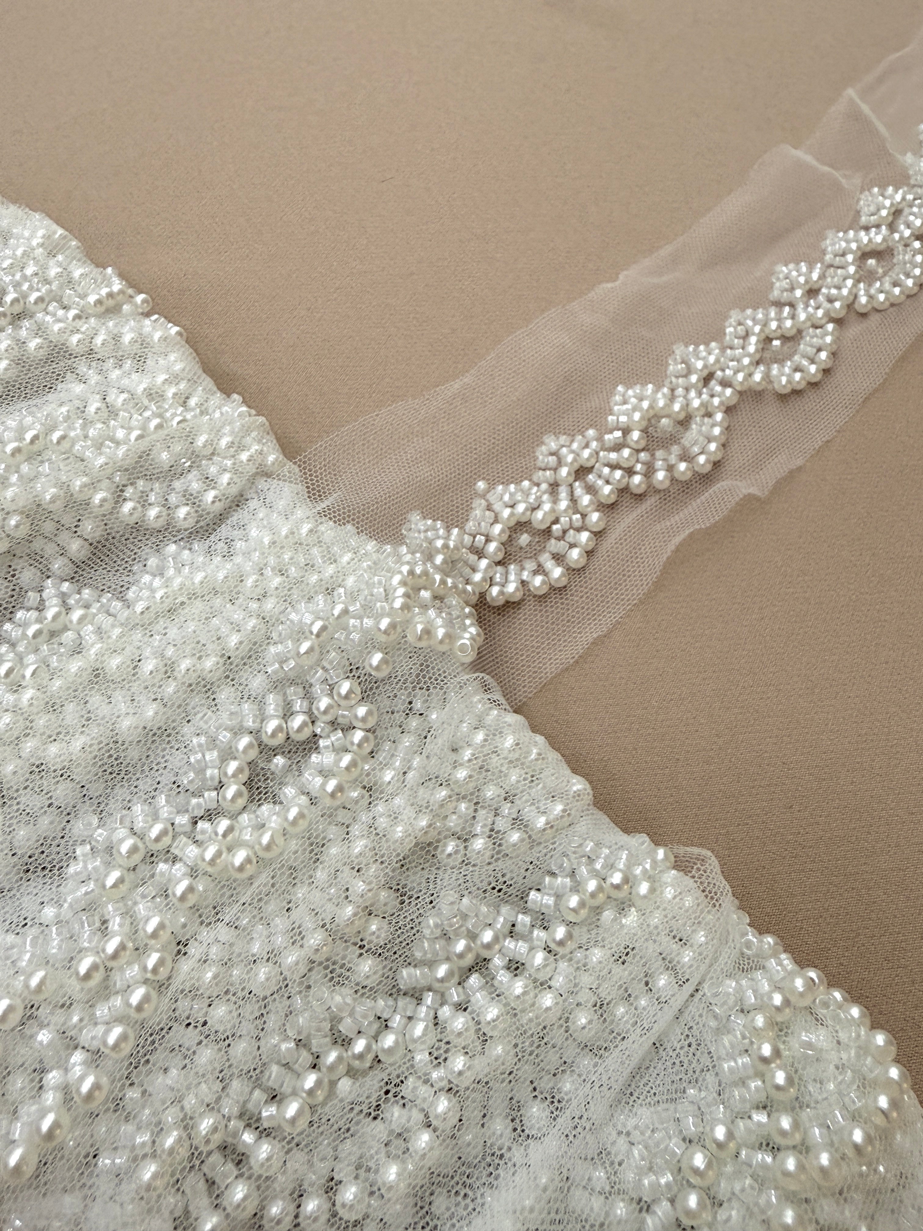 Braul decorativ ivory cu perle si margele este creat pentru proiecte vestimentare in care accentul este pus pe detaliu si echilibru vizual. Designul sau elegant este definit de siruri fine de perle si margele aplicate uniform, care adauga textura si un plus de rafinament fara a domina compozitia piesei.