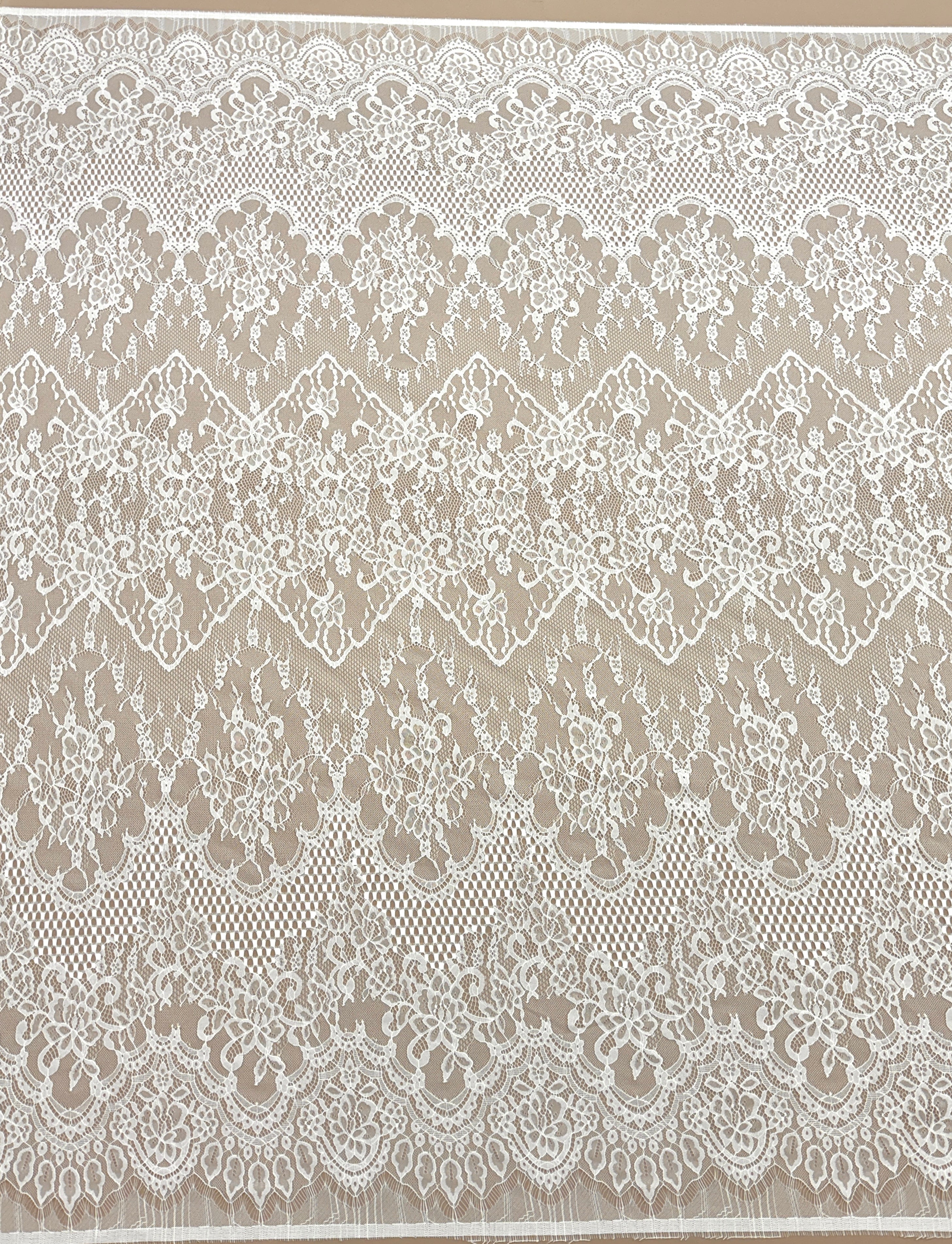 Csipke Chantilly virágmintás, ivory árnyalatban ideális választás kifinomult ruhakreációkhoz, ahol a finomság és az elegancia elengedhetetlen. A klasszikus, finoman kidolgozott mintázatot díszes szegélyek egészítik ki, couture hatást és tökéletes kivitelezést biztosítva a kész daraboknak.