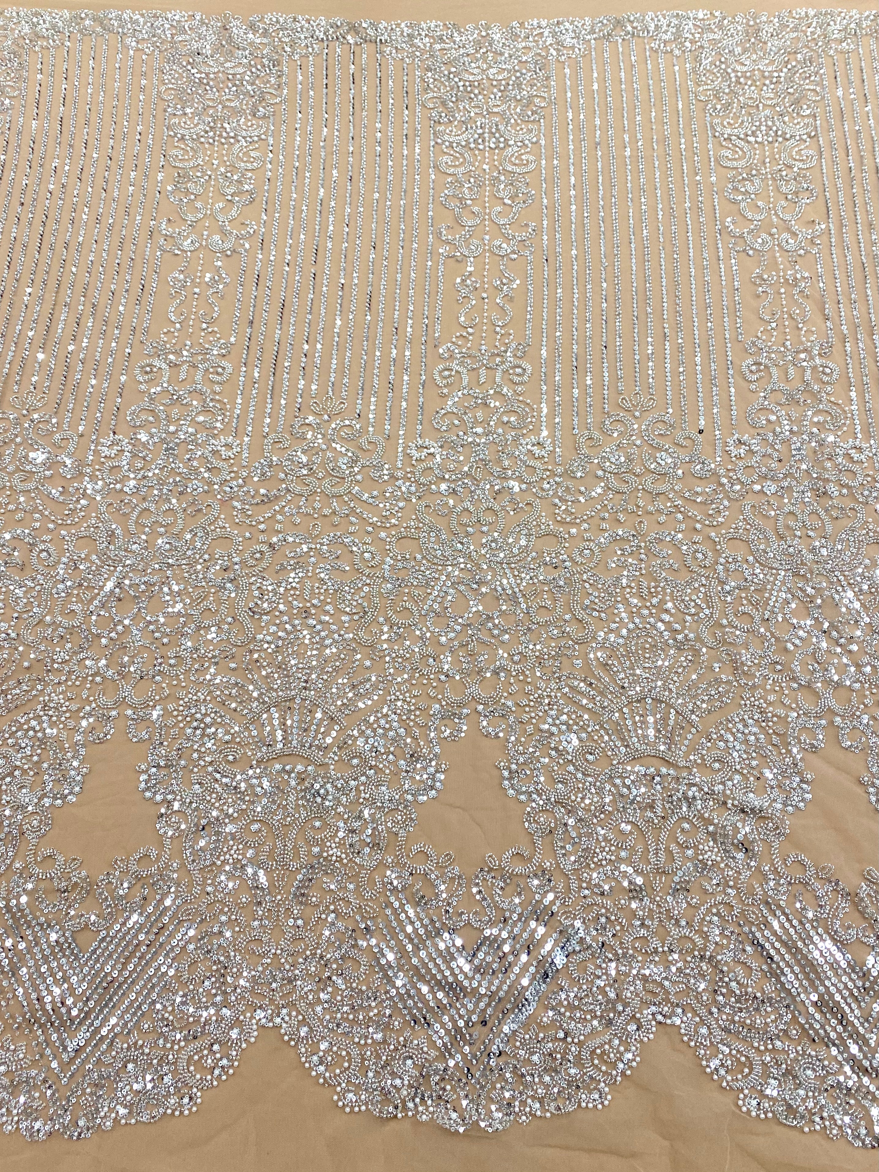Csipke Couture ezüst tüllön, nude alapon, geometrikus mintával, gyöngyökkel, gyöngy díszítéssel és flitterekkel