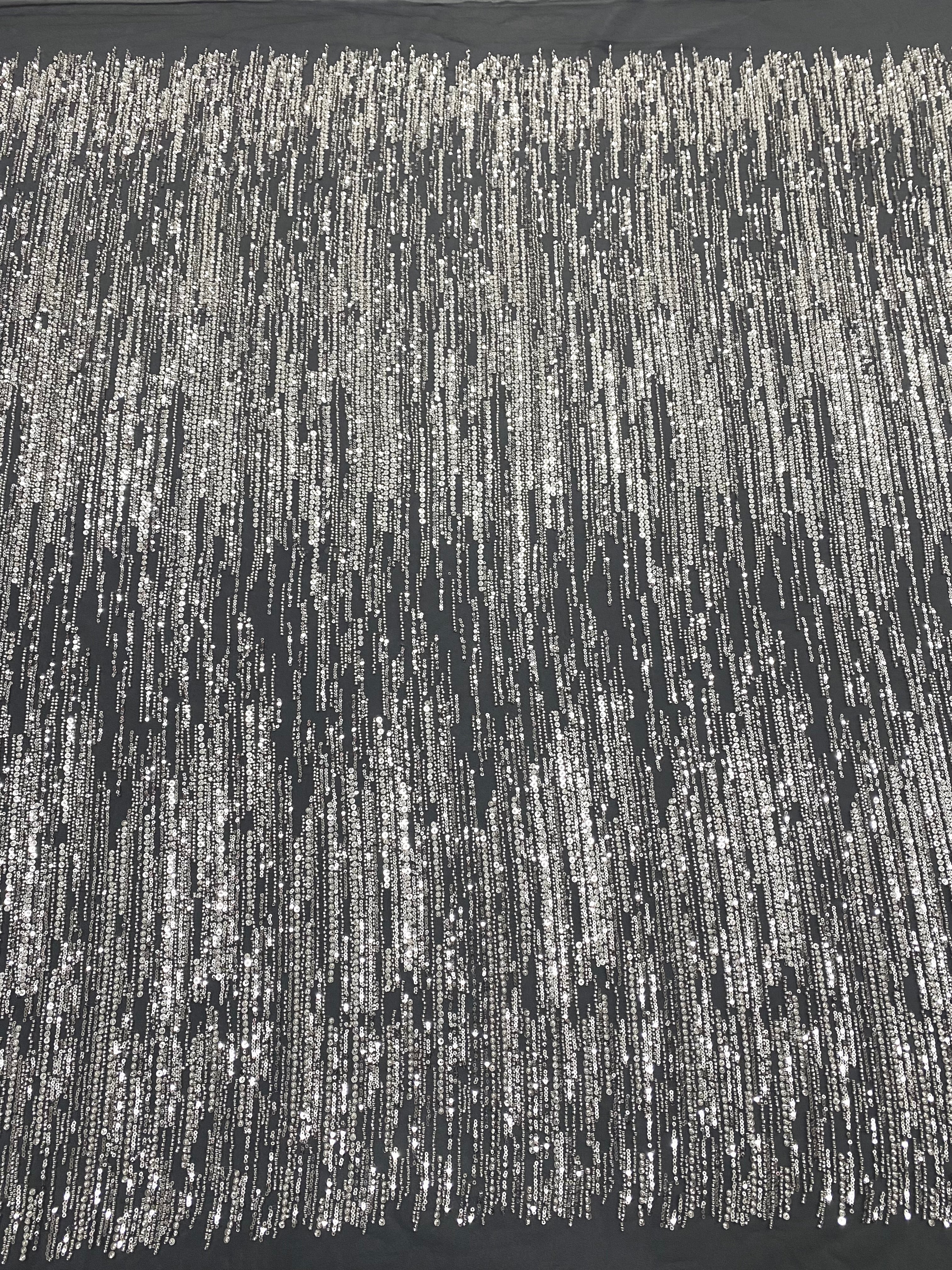 Csipke Couture ezüst színben antracitszürke tüllön, lineáris mintával, gyöngyökkel és flitterekkel