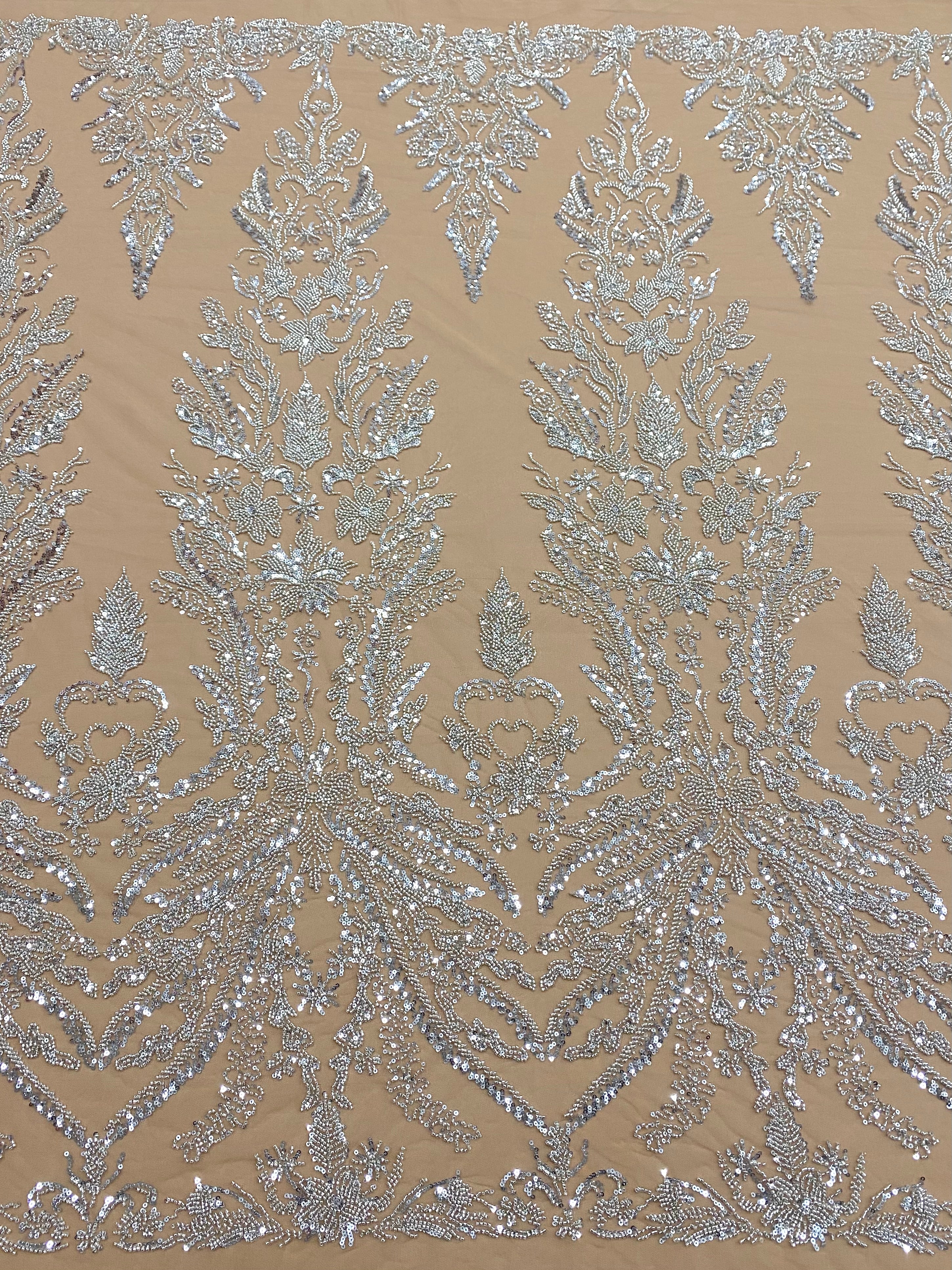 Csipke Couture ezüst tüll nude alapon, virágmintával, gyöngyökkel és flitterekkel