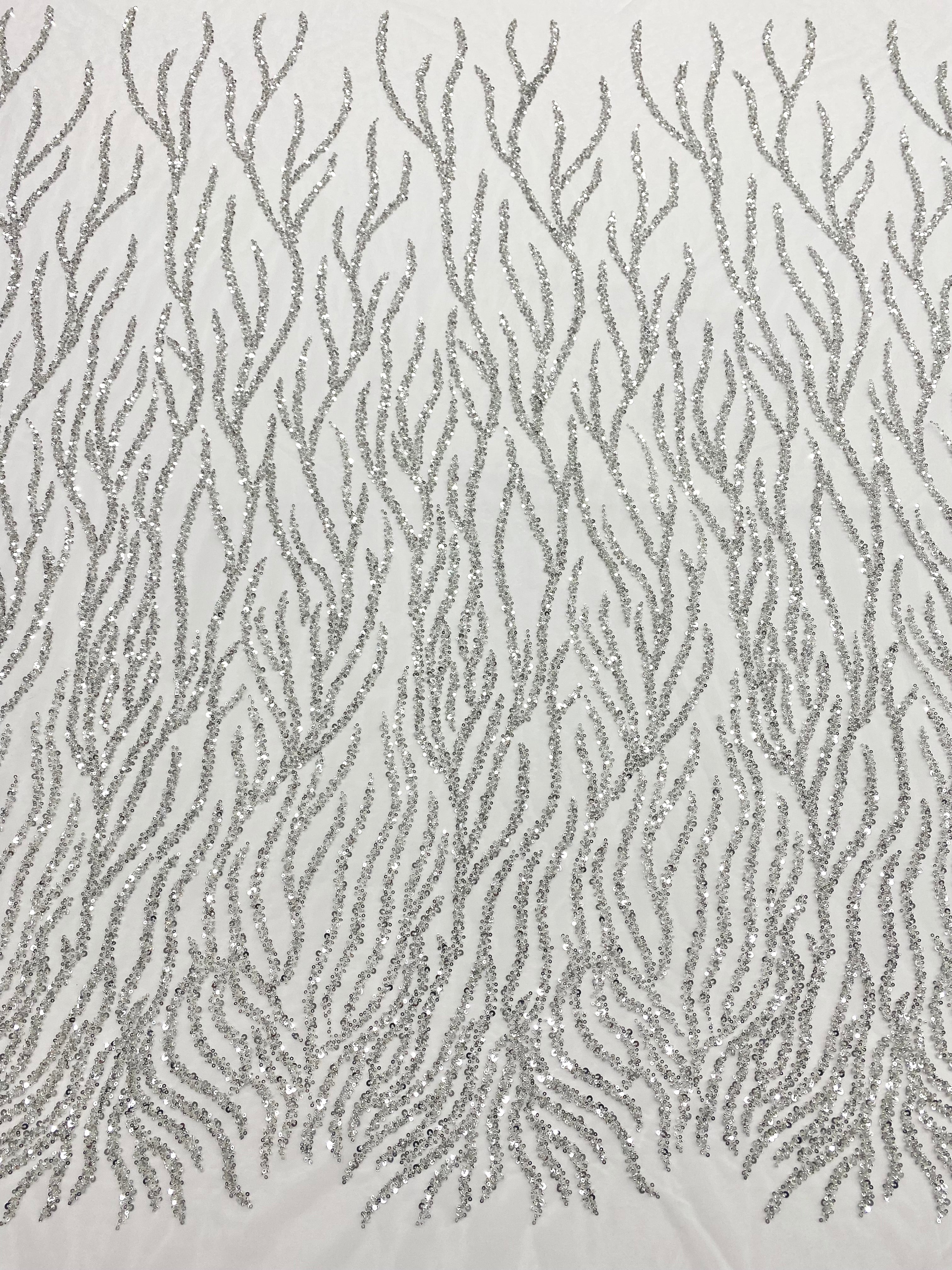 Csipke Couture ezüst tüllön, elefántcsont színben, gyöngy- és flitterfüzérekkel, gyöngyökkel és flitterekkel