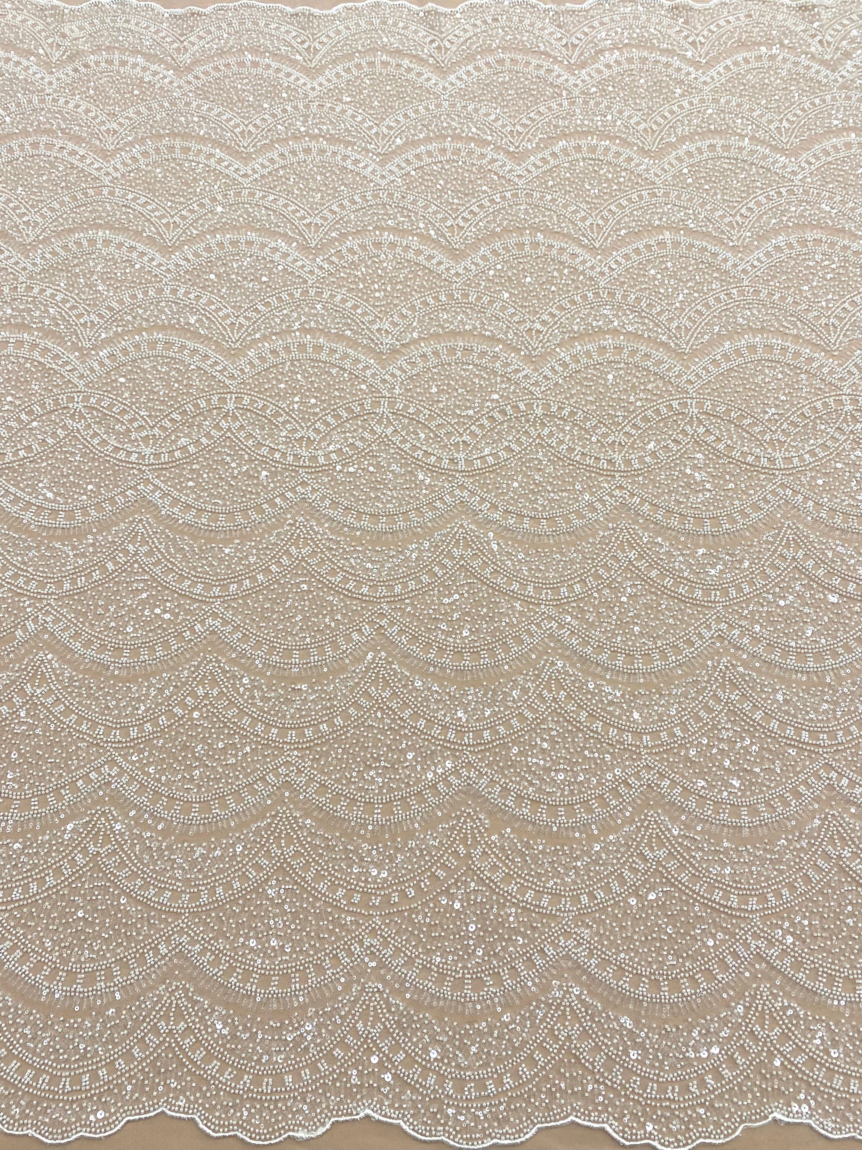 Elefántcsont csipke geometriai mintával, gyöngyökkel és flitterekkel