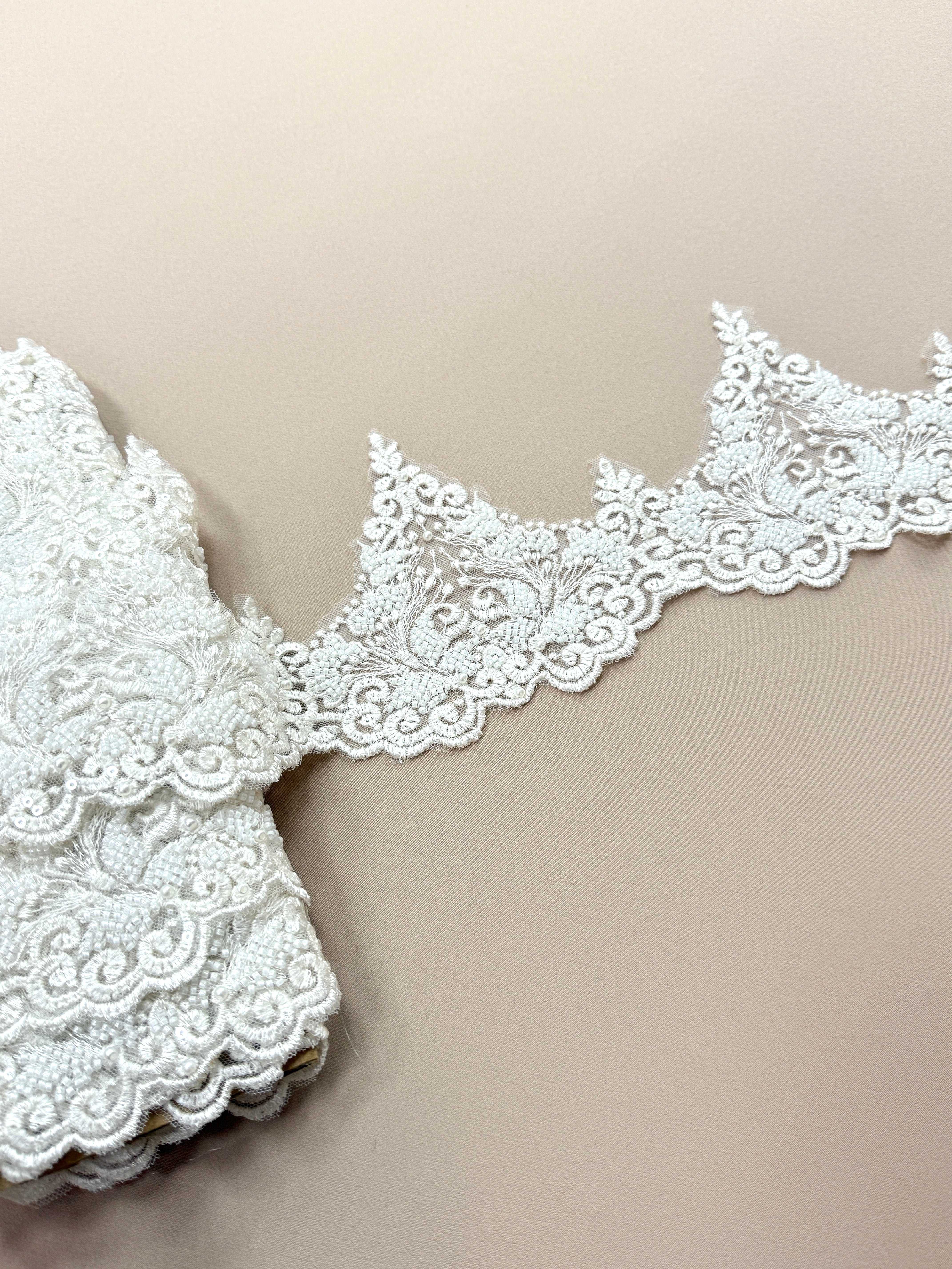 Este ideala pentru voaluri de mireasa, margini de rochii, corsete sau aplicatii decorative care necesita un accent elegant, fara a incarca vizual piesa. Textura permite o integrare usoara in diverse creatii vestimentare, iar ornamentatia adauga profunzime si lumina materialului.
