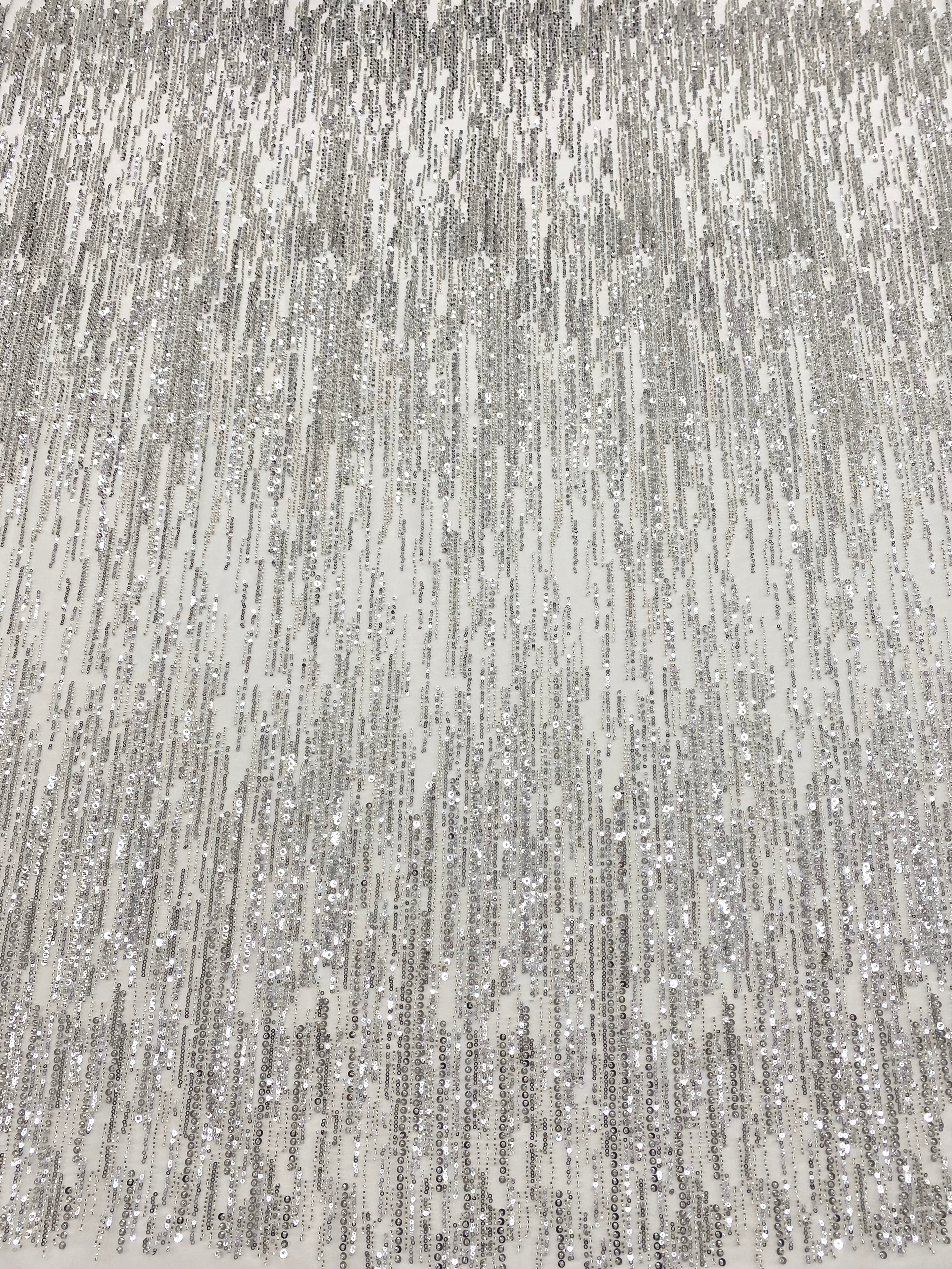 Dantela Couture Argintie pe Tulle Ivory cu Model Liniar, cu Margele si Paiete