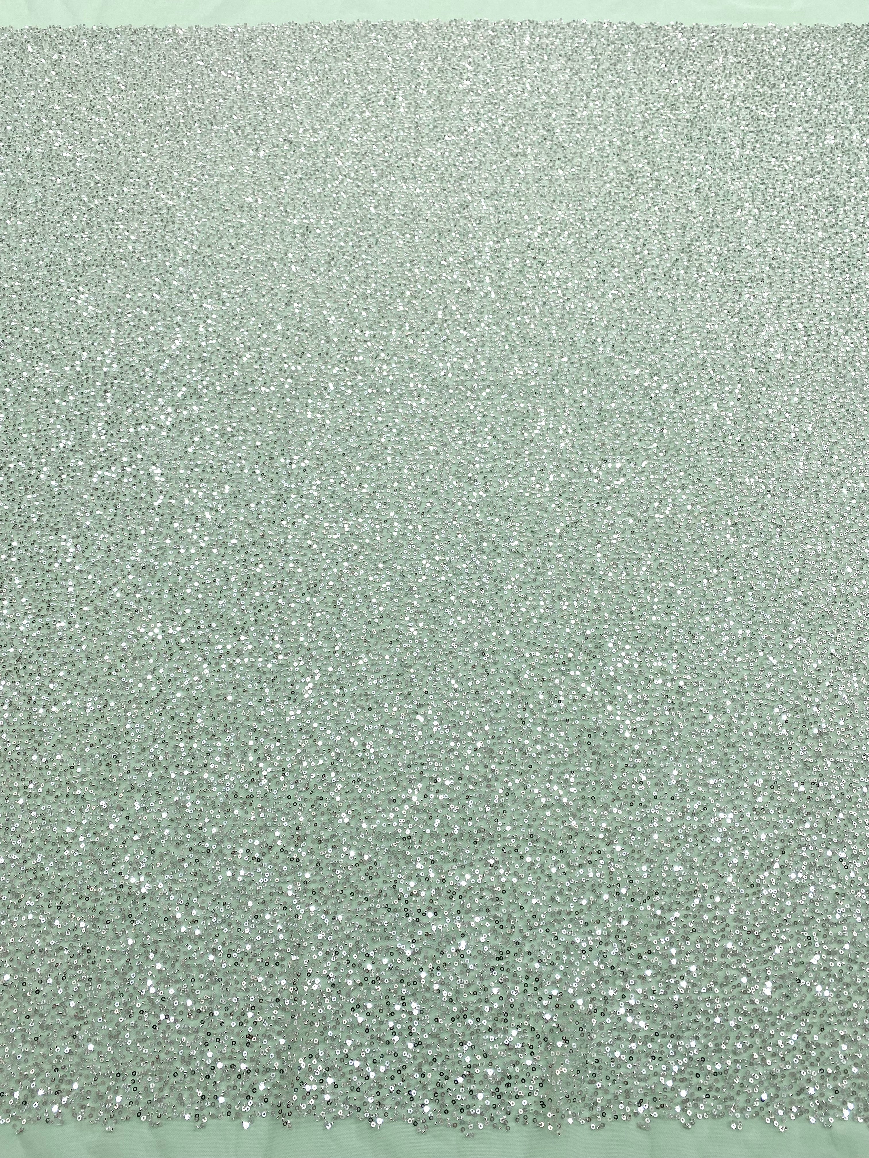Dantela Couture Argintie pe Tulle Verde Menta cu Model General, cu Margele si Paiete