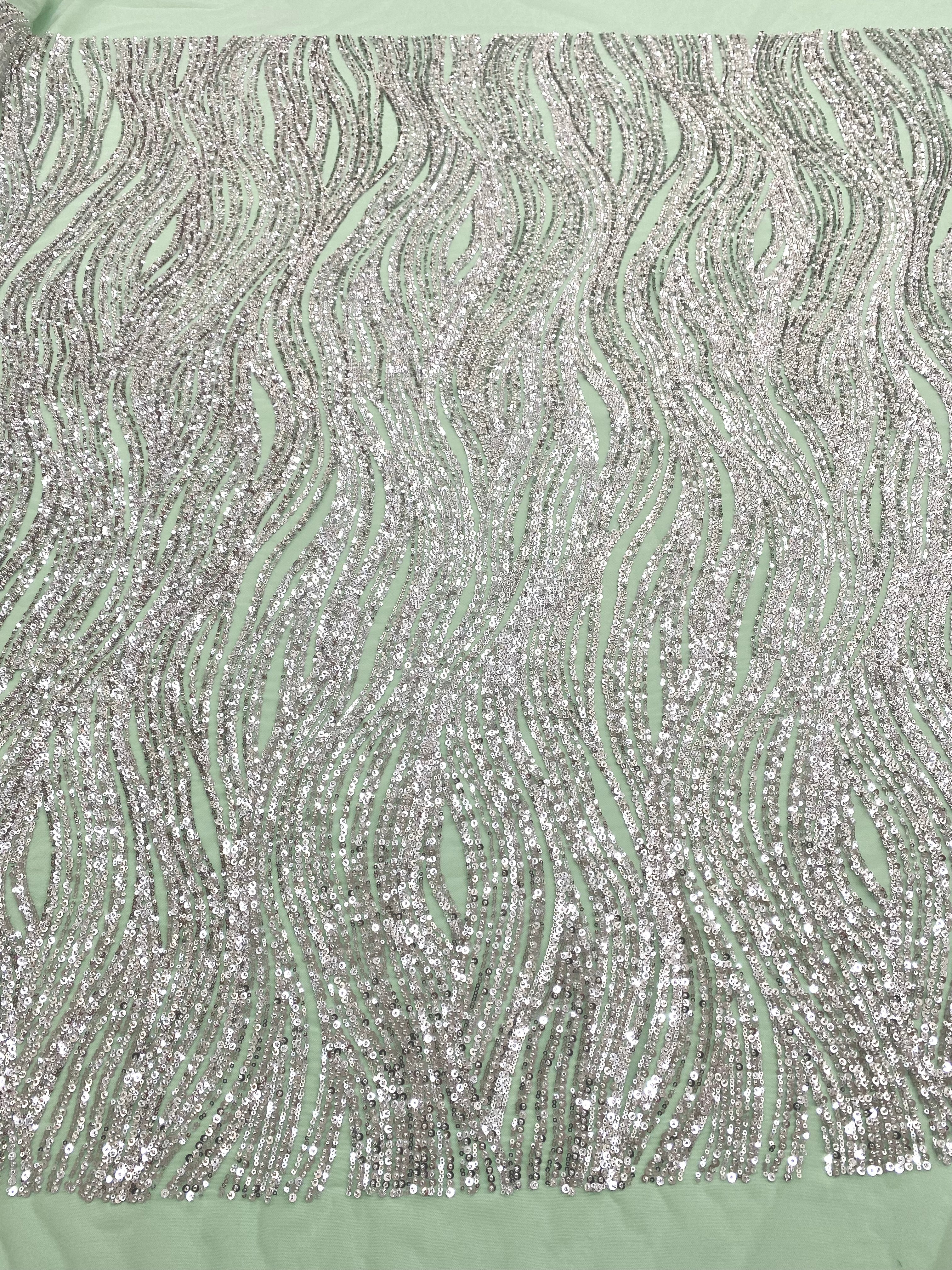 Dantela Couture Argintie pe Tulle Verde Menta cu Model Liniar, cu Margele si Paiete