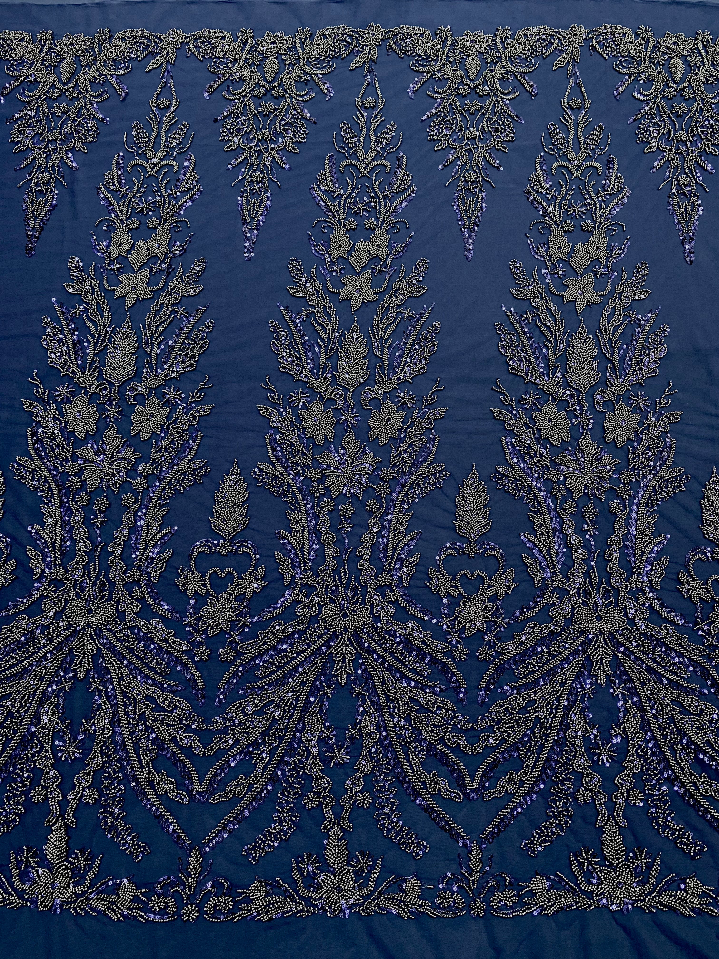 Dantela Couture Bleumarin cu Model Floral, cu Margele si Paiete