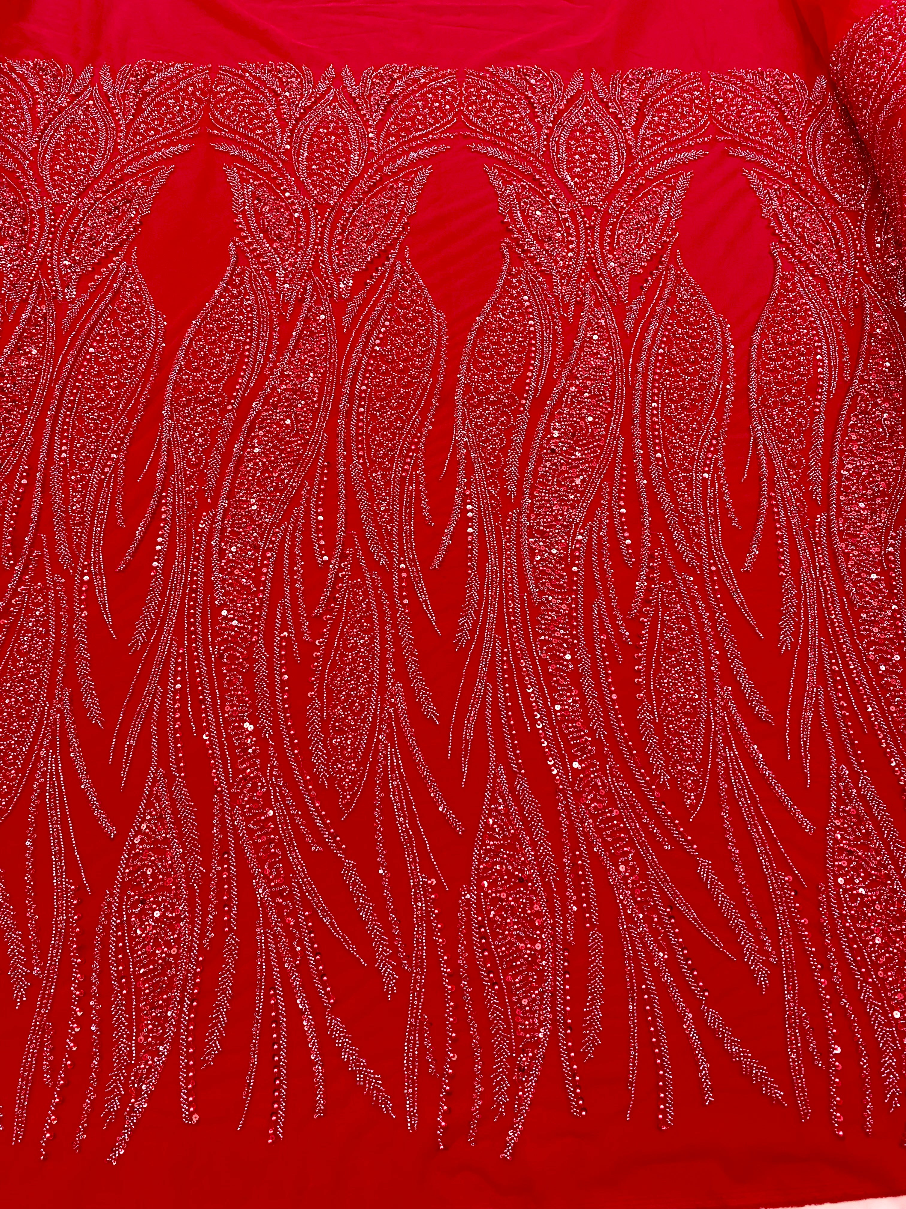 Piros Couture csipke geometriai mintával, gyöngyökkel, gyöngyöcskékkel és flitterekkel