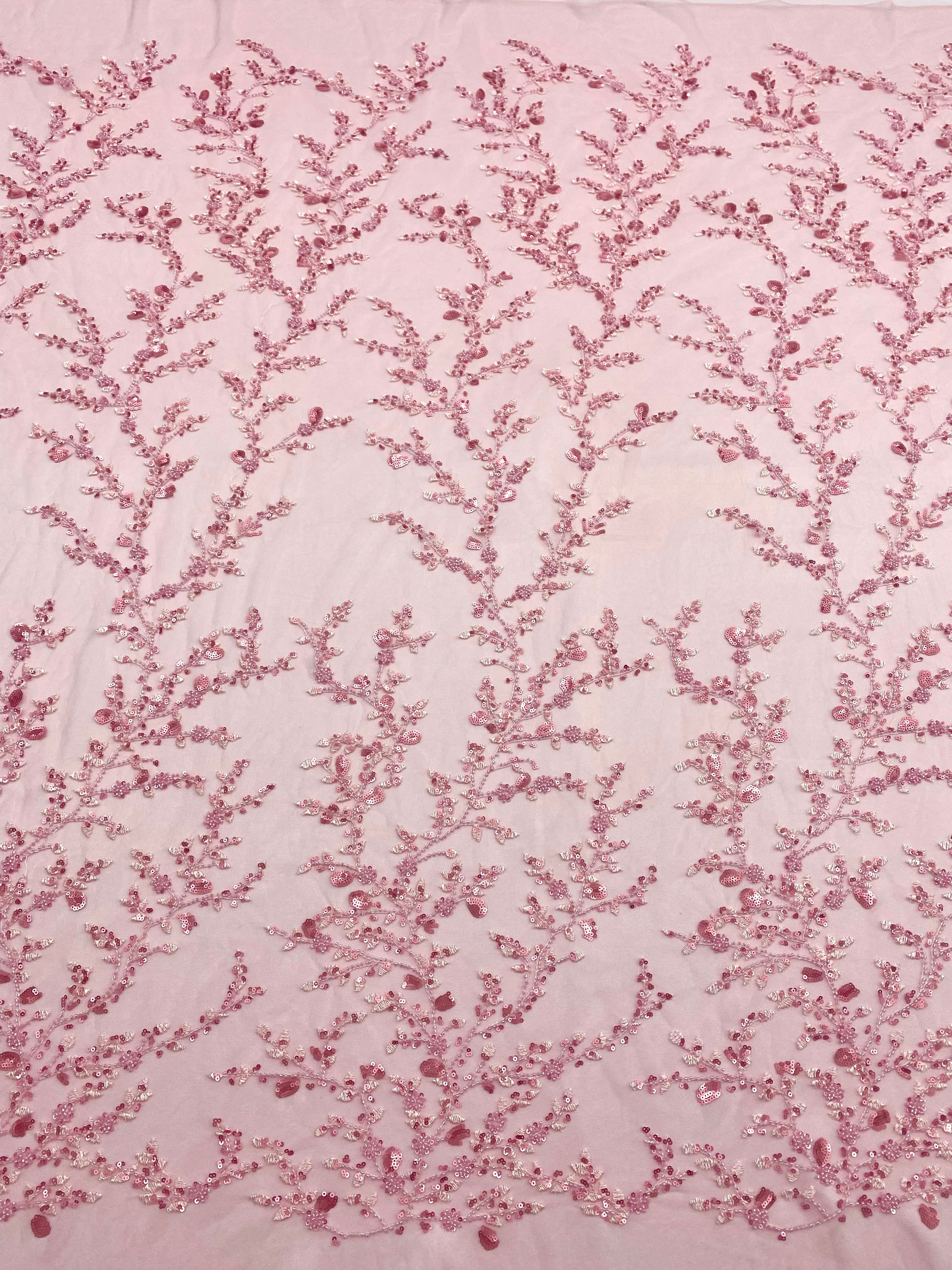 Dantela Couture Roz cu Model Floral, cu Margele si Paiete