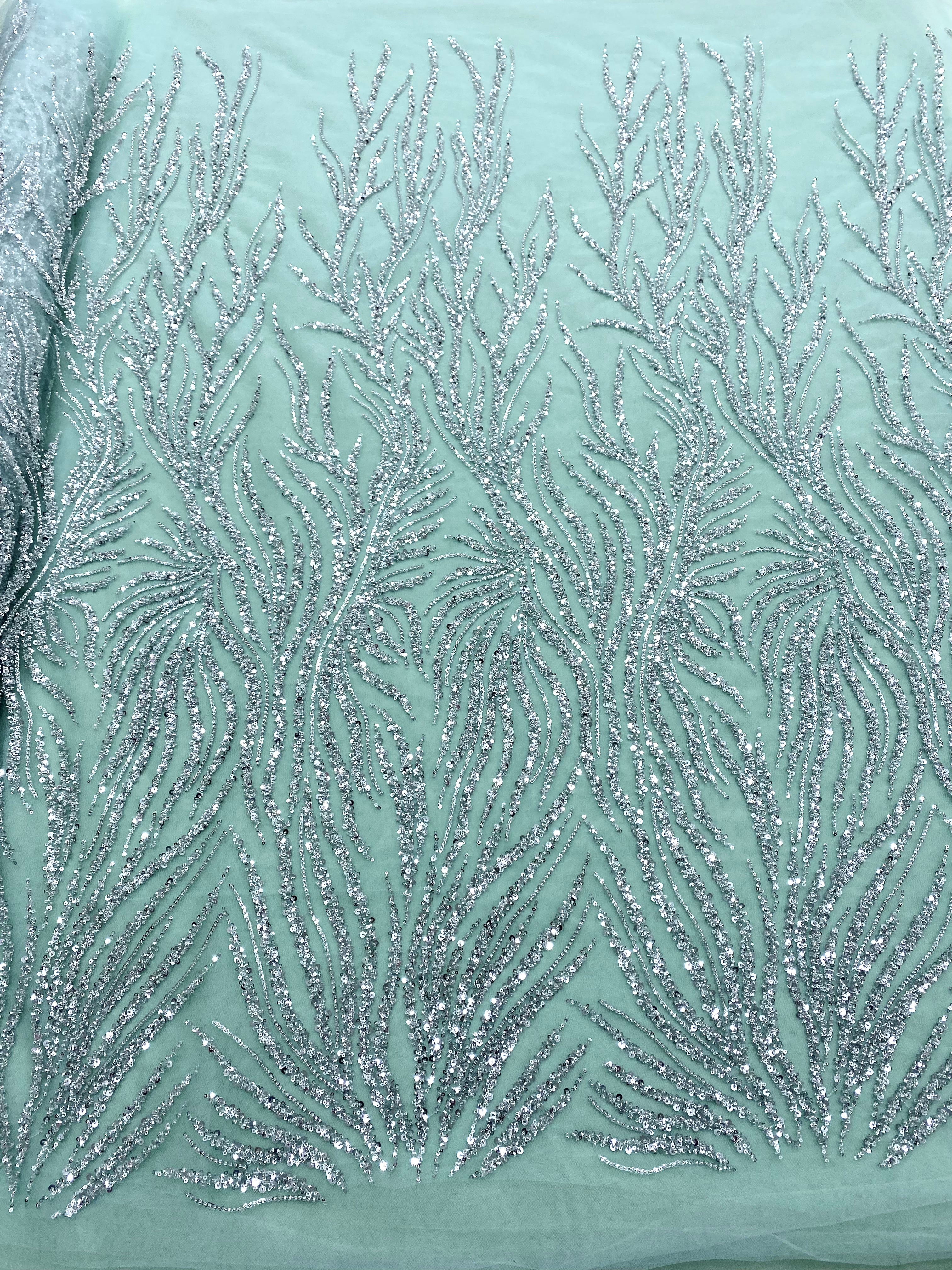 Ezüst Couture Csipke Mentazöld Tüllön Gyöngyökkel és Flitterekkel