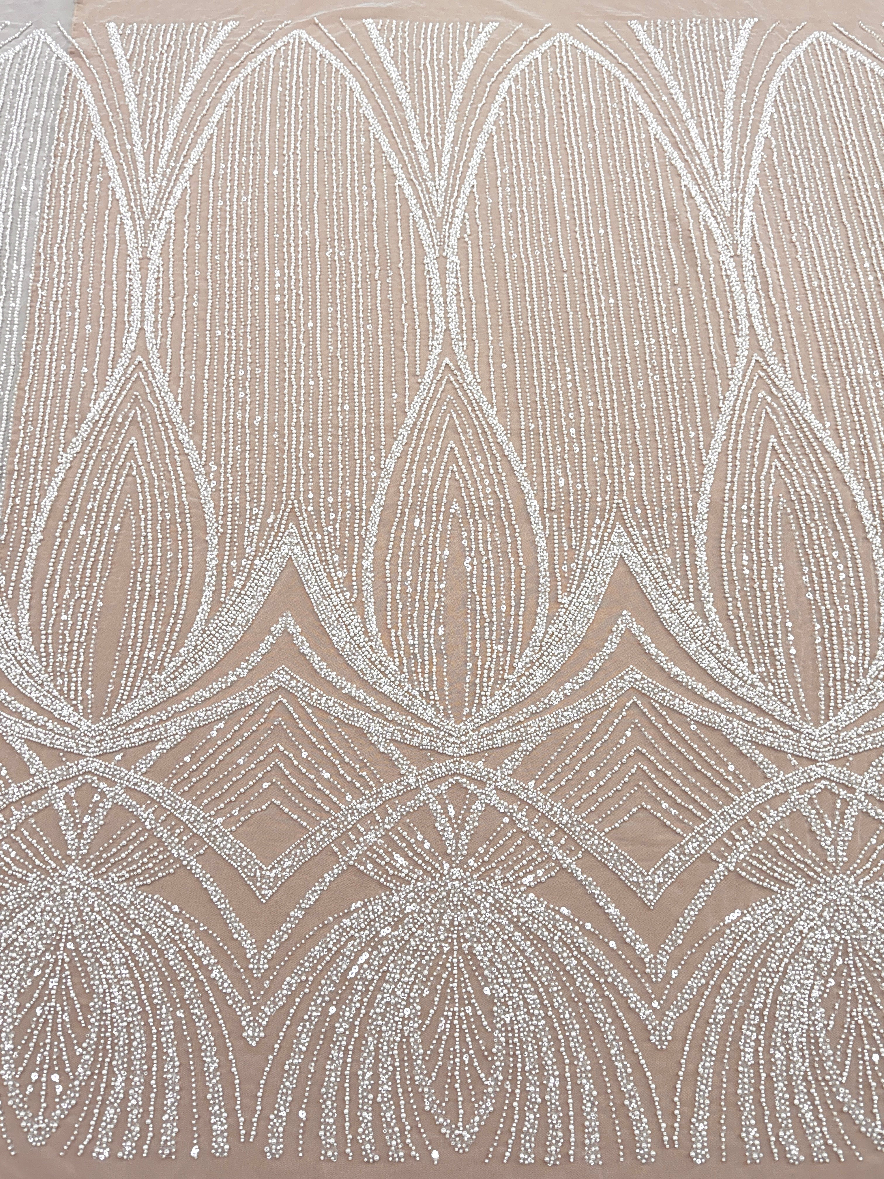 Dantela Ivory cu Model Geometric, cu Perle, Margele si Paiete