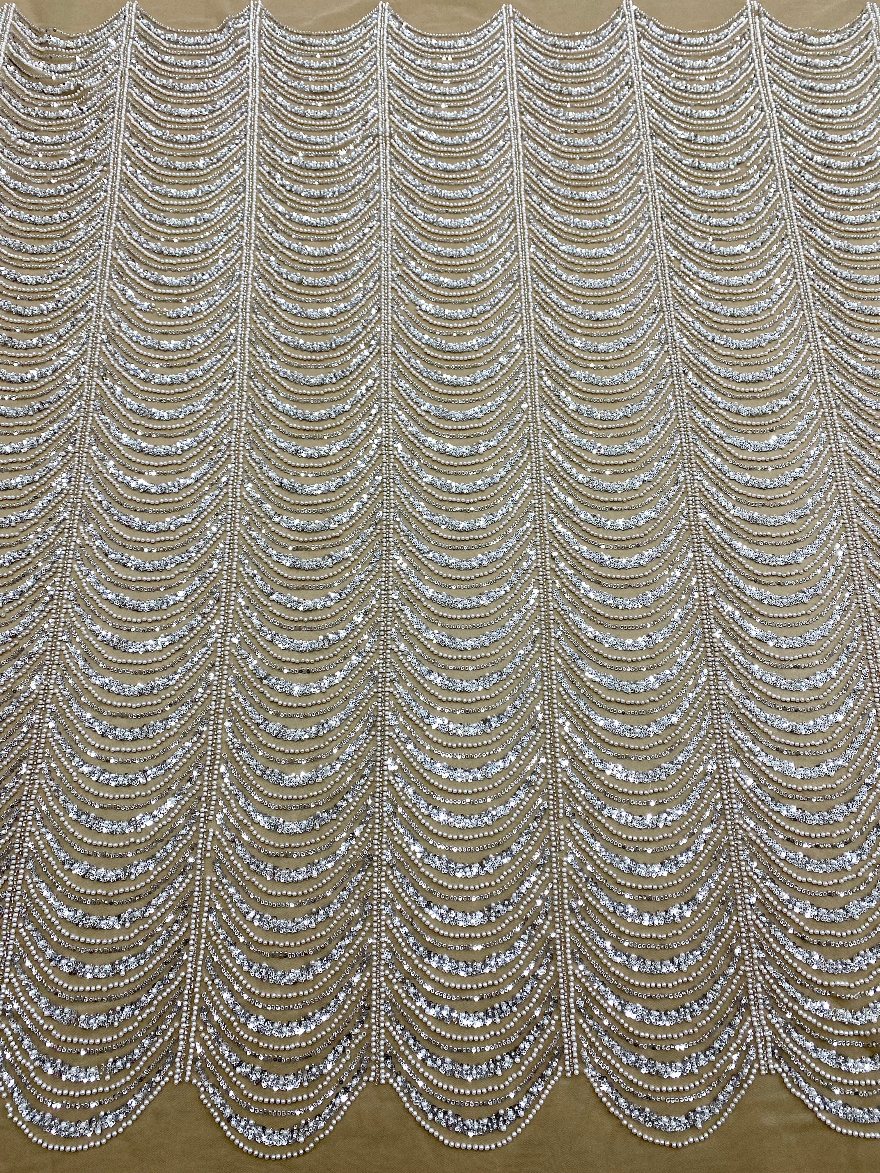 Ezüst Couture Csipke Nude Tüllön Geometriai Mintával, Gyöngyökkel, Gyöngyökkel és Flitterekkel