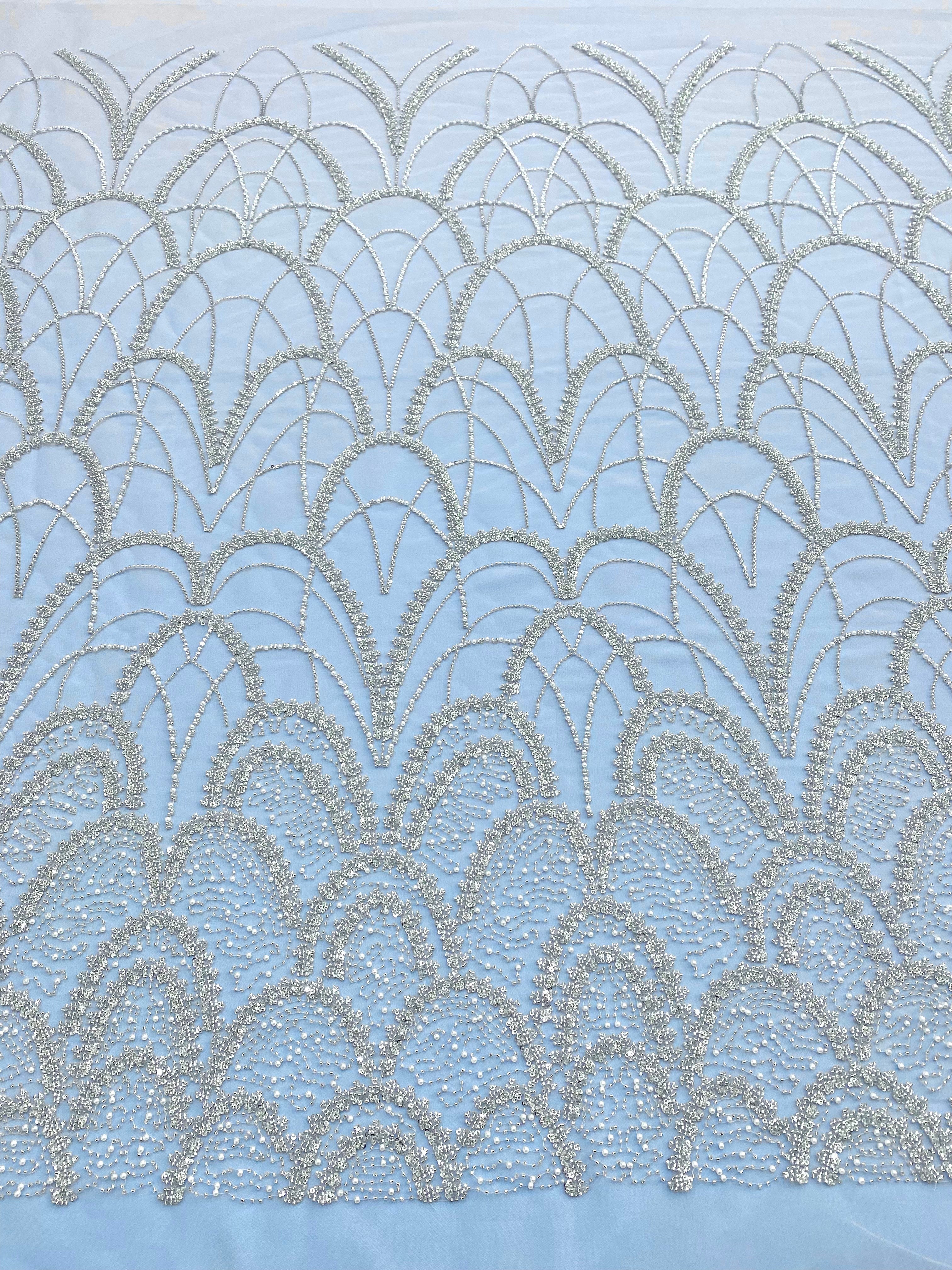 Dantela Couture Argintie cu Tulle Baby Blue cu Model Geometric, cu Perle, Margele Si Paiete