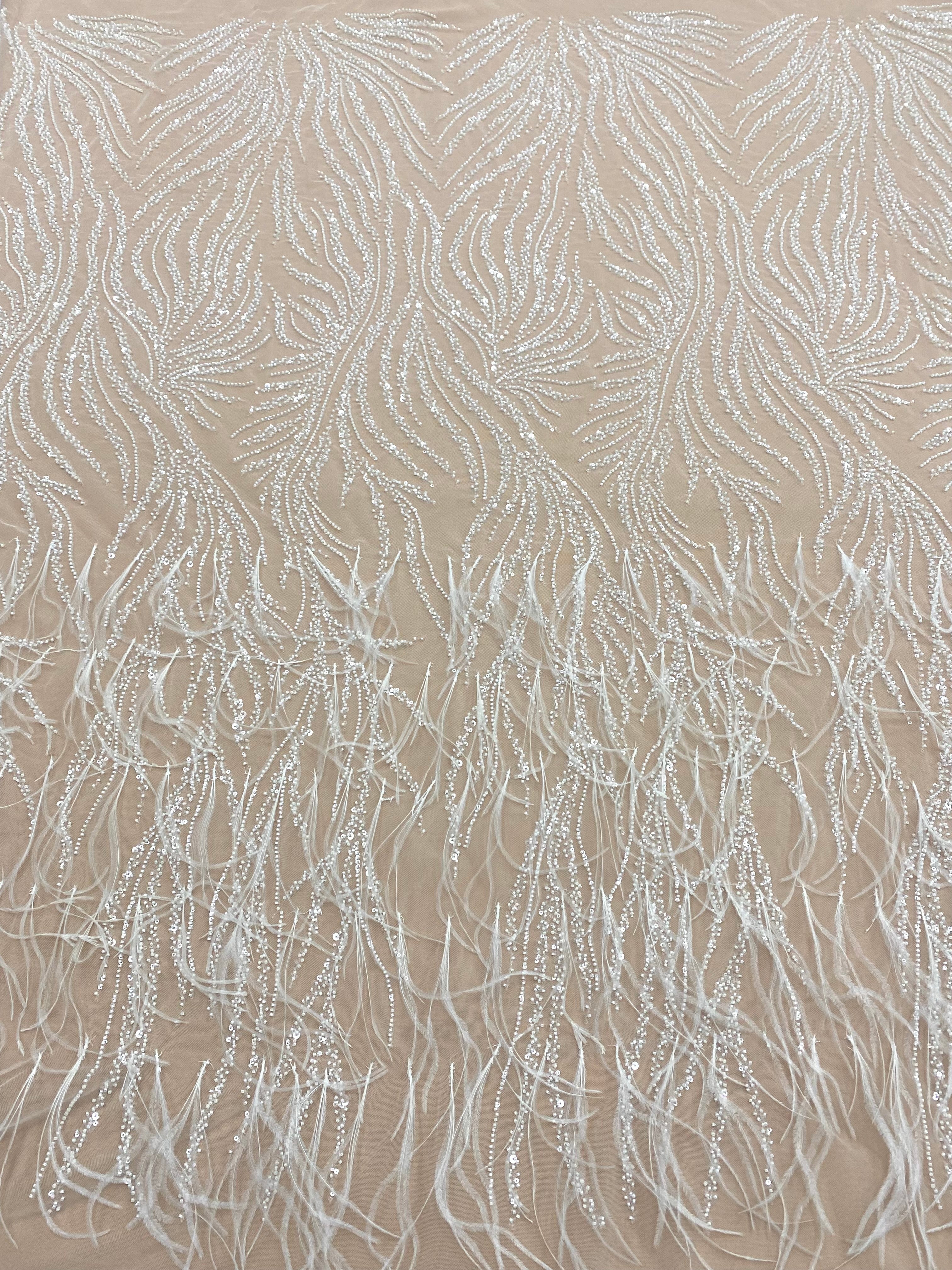Dantela Couture Ivory cu Pene de Strut, cu Siraguri, cu Margele si Paiete