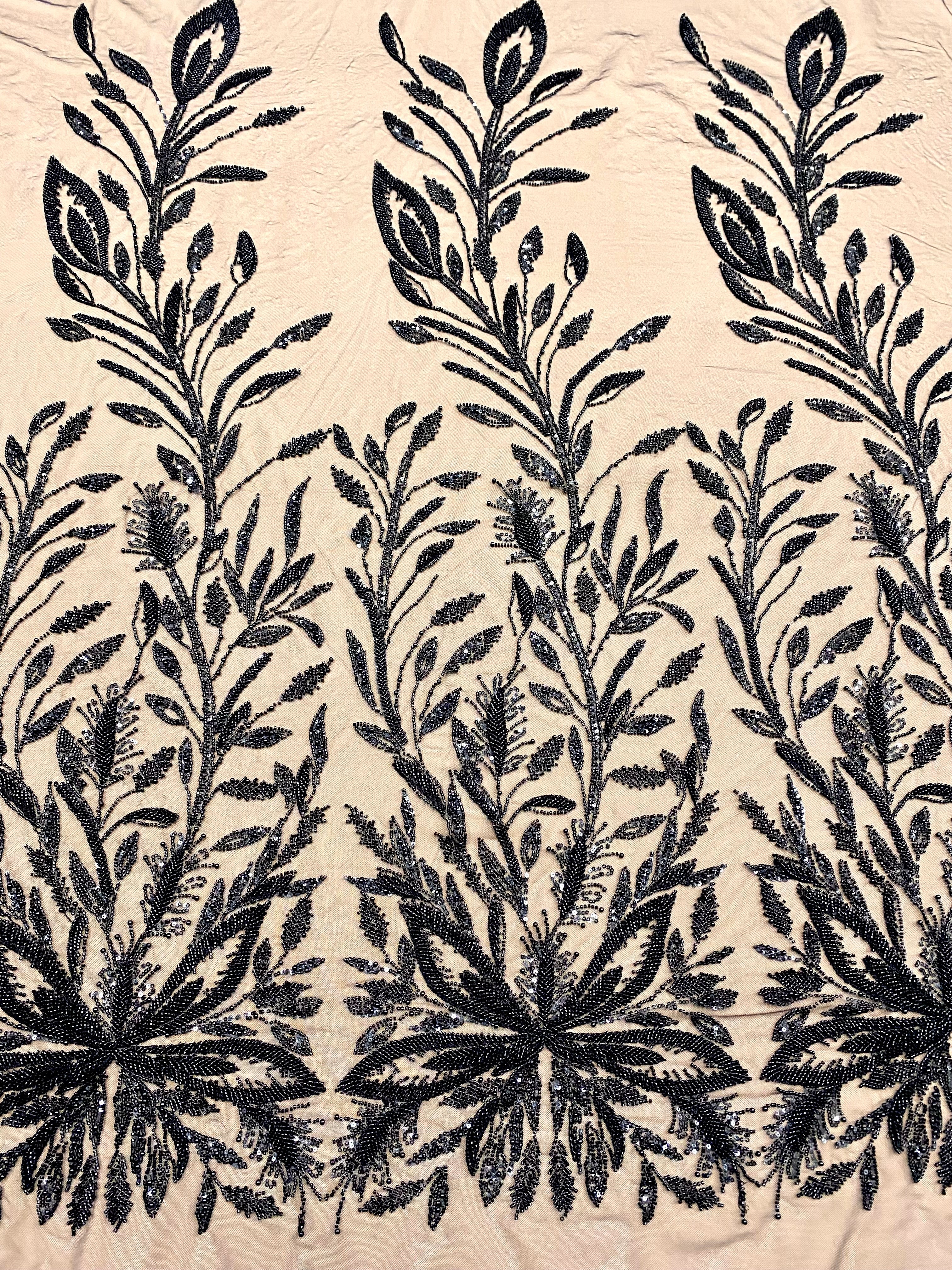 Dantela Couture Neagra cu Model Floral, cu Perle, Margele si Paiete